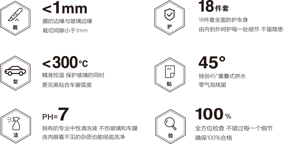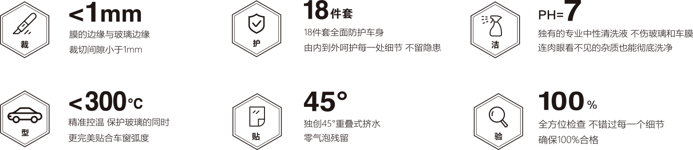 - 洁净的施工环境:避免车窗上存在灰尘,保证装贴后车膜不会起泡、翘边。